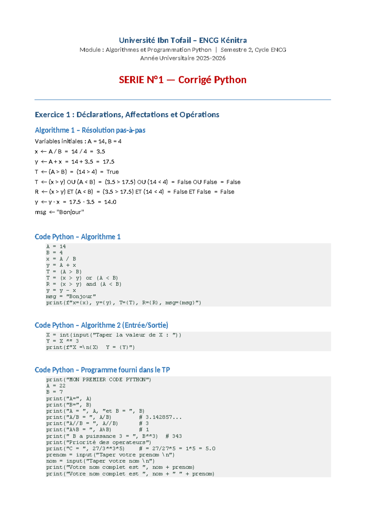 Serie 1 - Corrigé Algorithmes et Programmation Python (ENCG) - Studocu