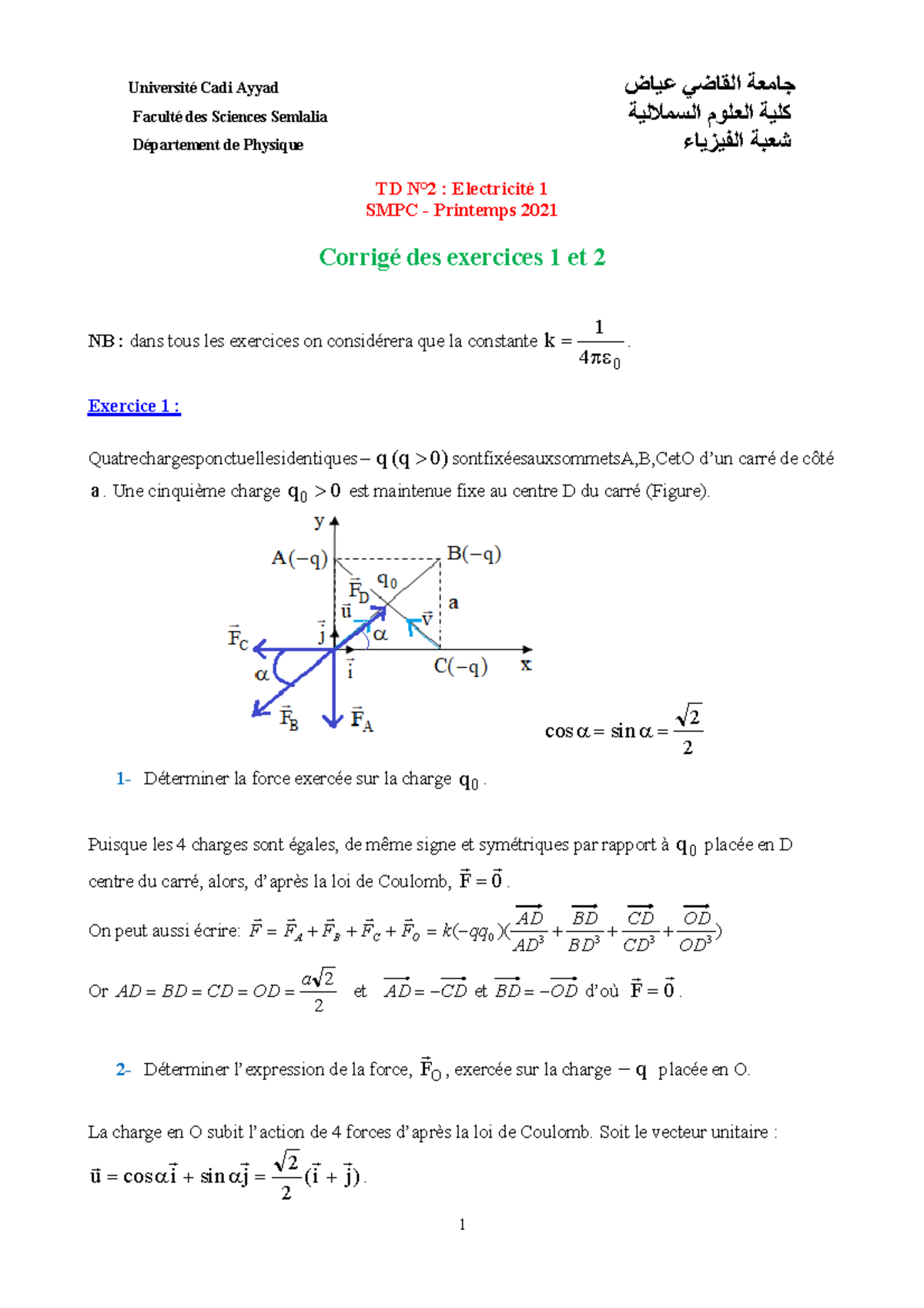 Corrigé des exercices 1 et 2 - TD Electricité 1 SMPC Printemps 2021 ...