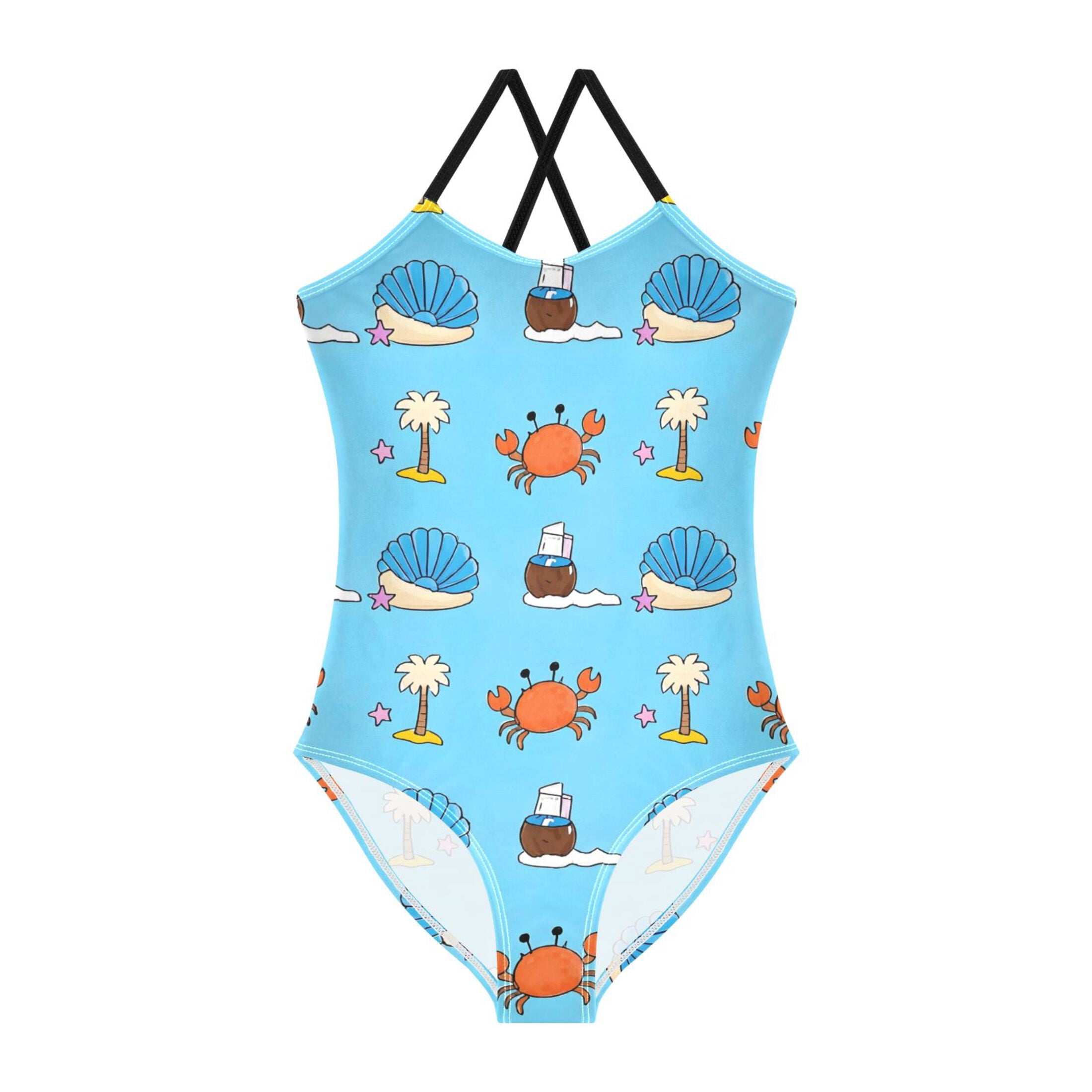 Crab Shell Coconut Tree Pattern Girls' One-Piece Swimwear 3T-10T Soft ...