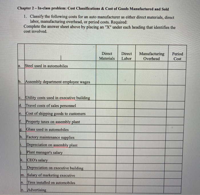 Solved Chapter 2 - In-class problem: Cost Classifications & | Chegg.com