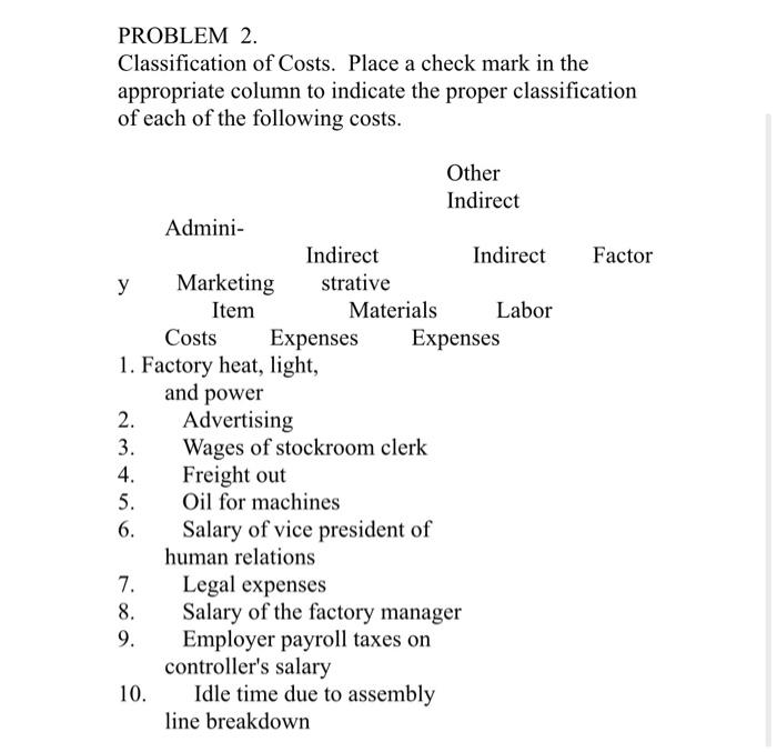 Solved PROBLEM 2. Classification of Costs. Place a check | Chegg.com