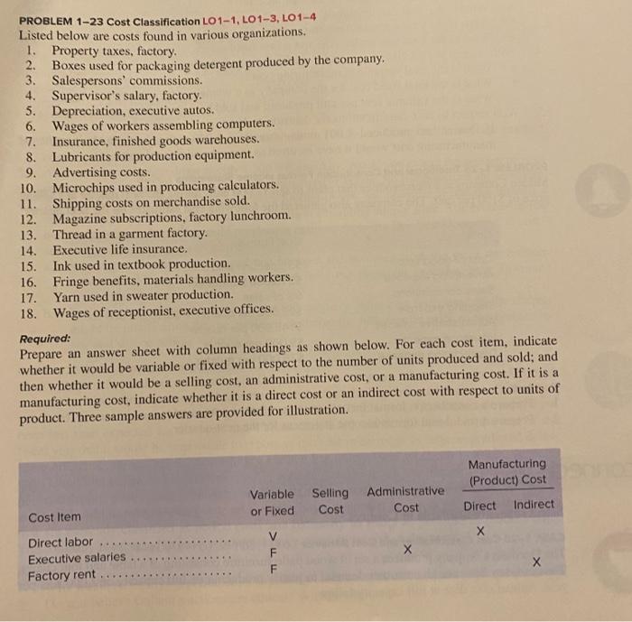 Solved Problem 1-23 (Static) Cost Classification (LO1-1, | Chegg.com