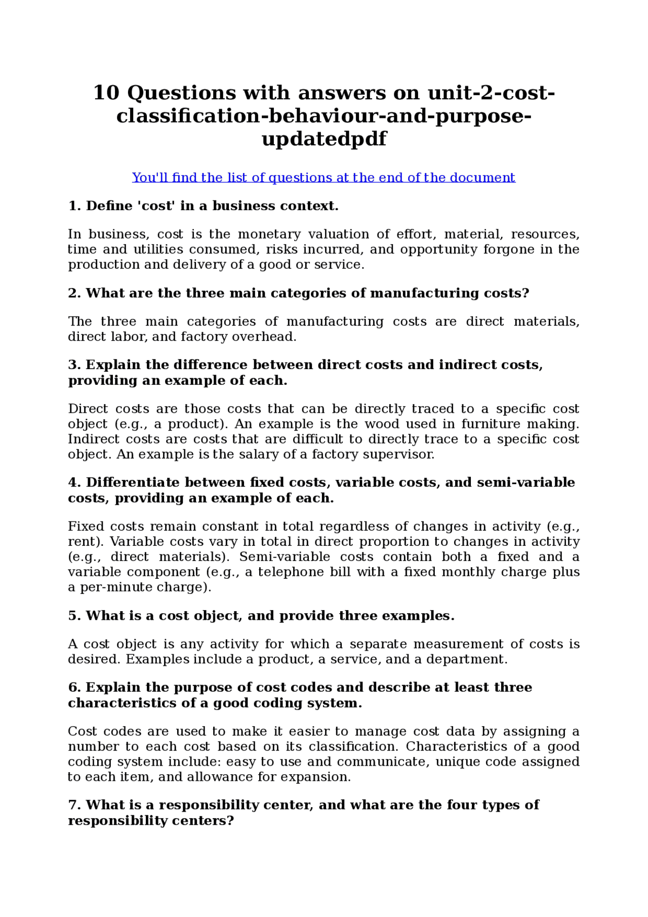 Questions and answers, Cost Classification in Business: A Comprehensive ...