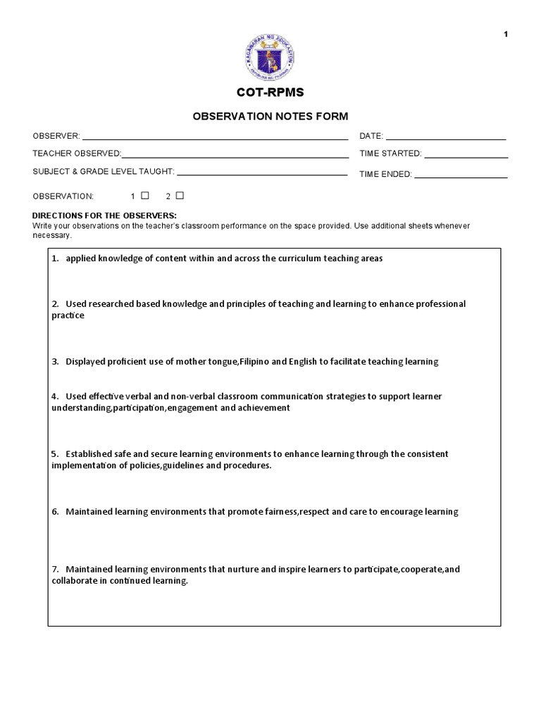 Cot - Rpms Observation Notes Form: Directions For The Observer | PDF ...