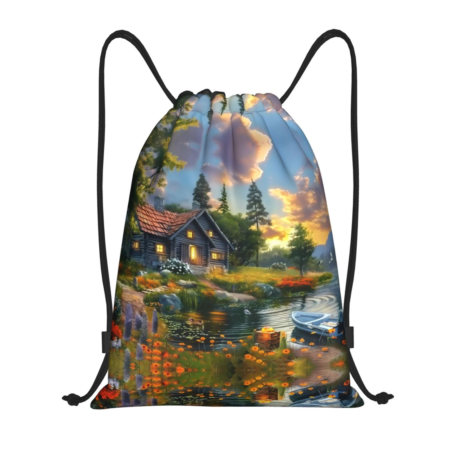 Drawstring Backpack - Cozy Cottage Lakeside Sunset Cheer Gym Bag for ...