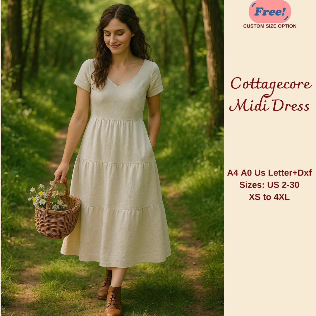 Linen Cottagecore Dress Sewing Pattern, Tiered Midi Dress PDF Sewing ...