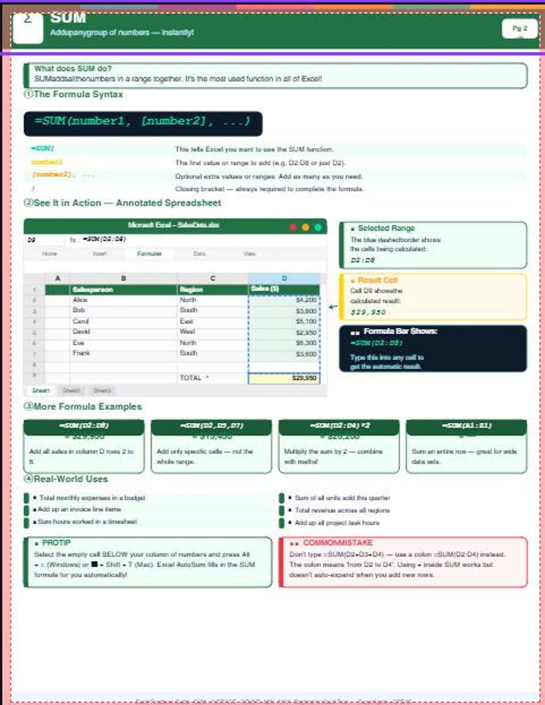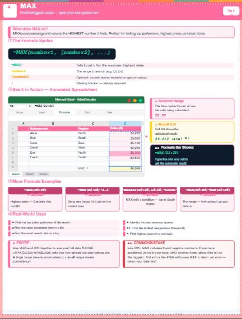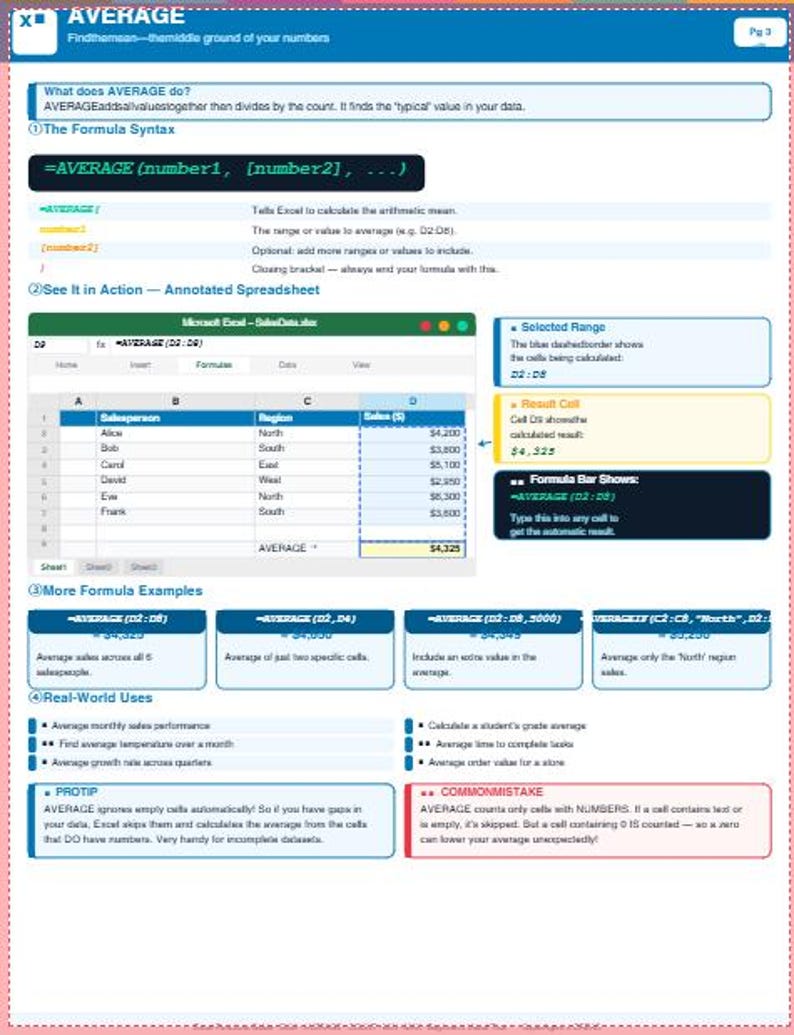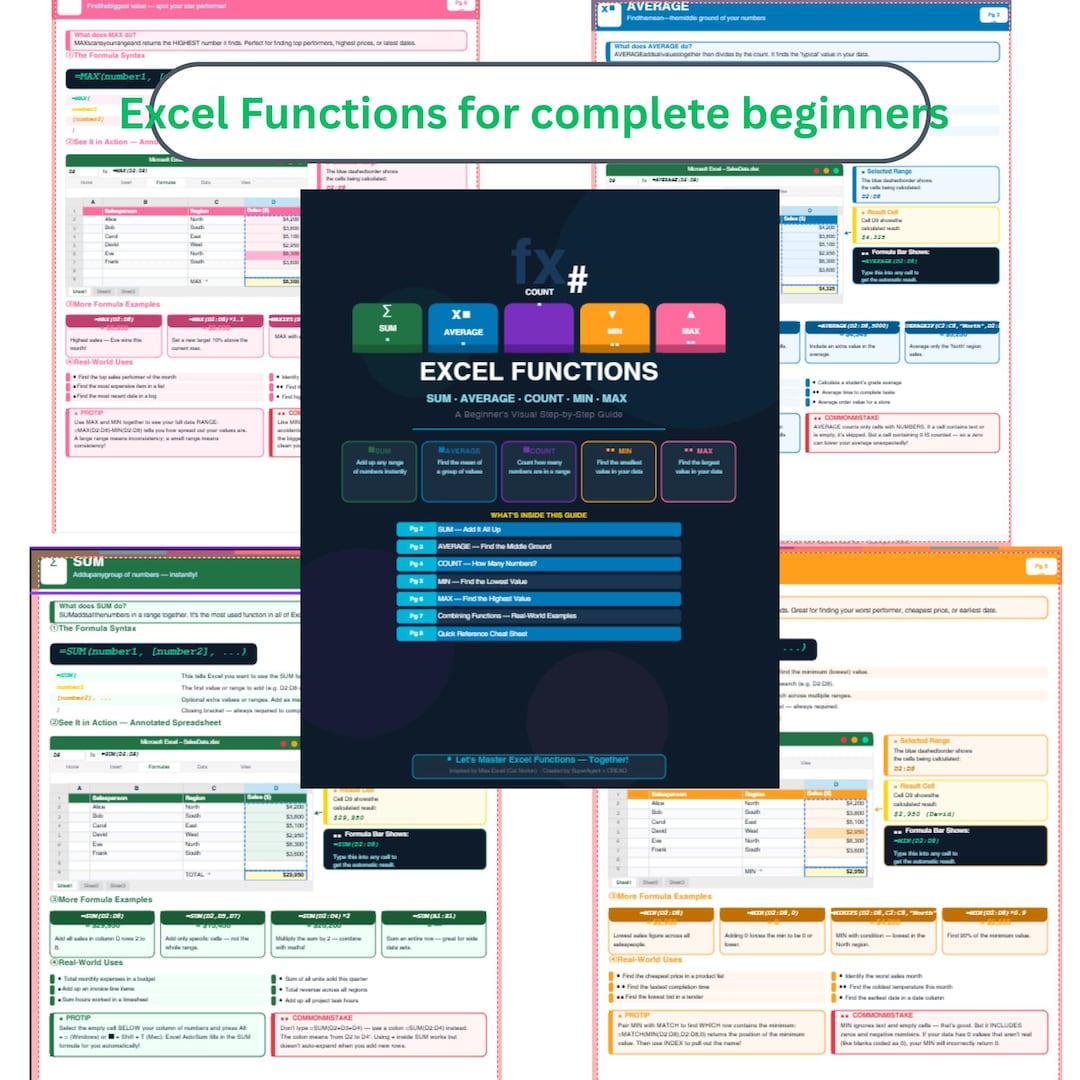 Excel Functions Cheat Sheet | Sum Average Count Min Max Guide (pdf ...