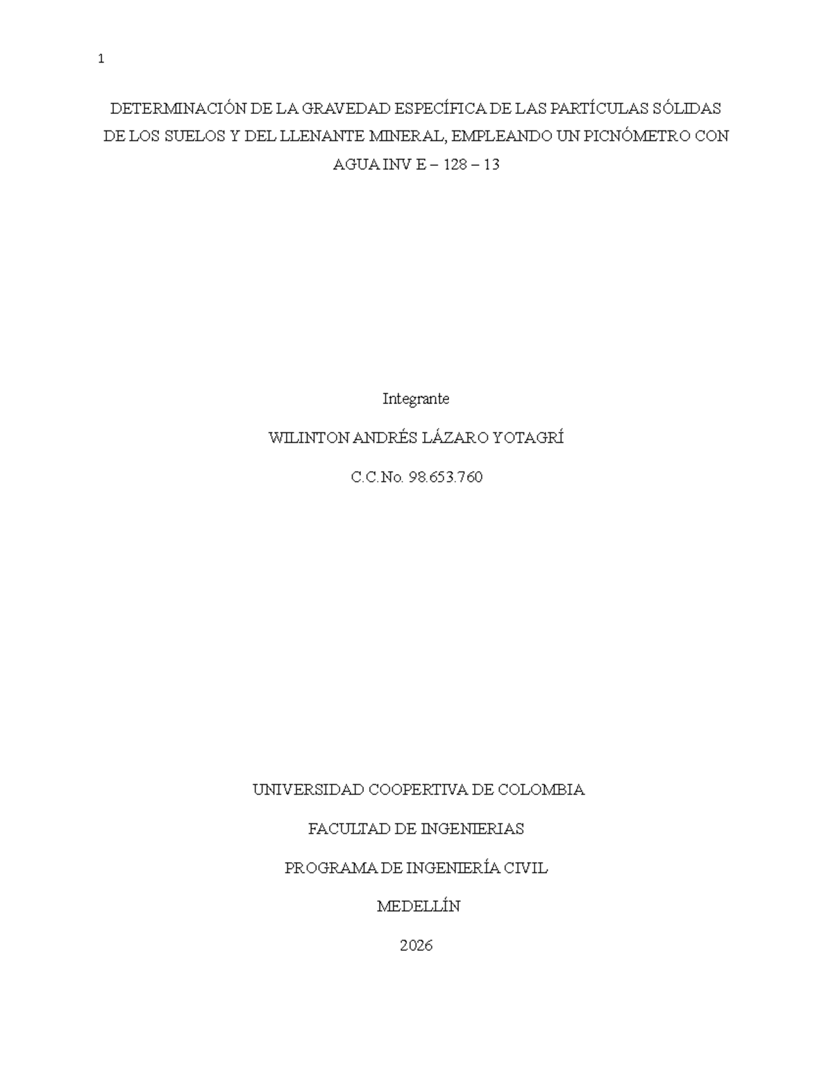 Informe de Laboratorio: Determinación de Gravedad Específica GS INV 128 ...