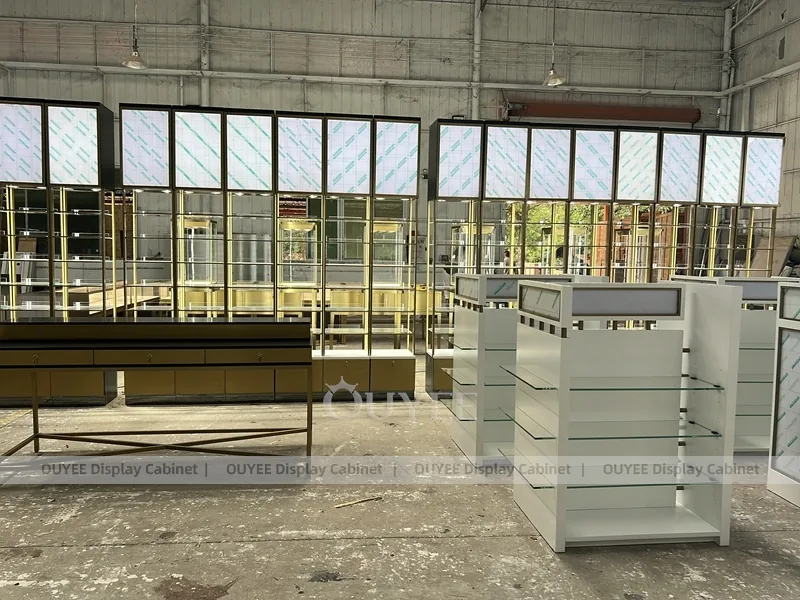 White Perfume Display Island Layout With Square Showcase Tables