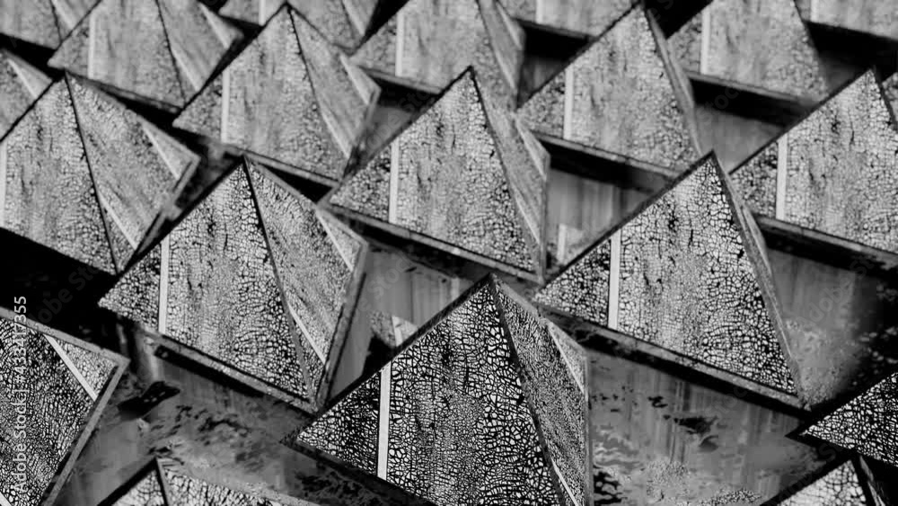rotating rows of black and white pyramids with cracked texture. looped ...