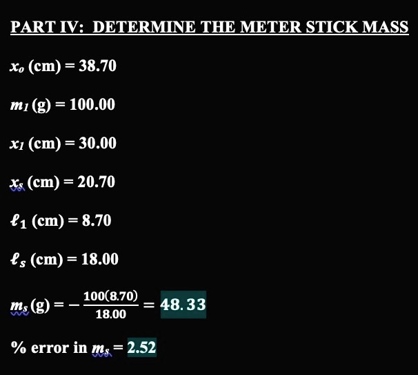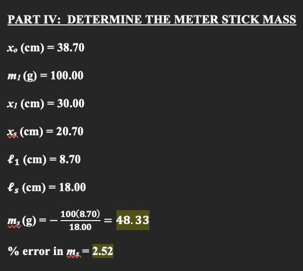 PART IV: DETERMINE THE METER STICK MASS xo (cm) = 38.70 m1 (g) = 100.00 ...