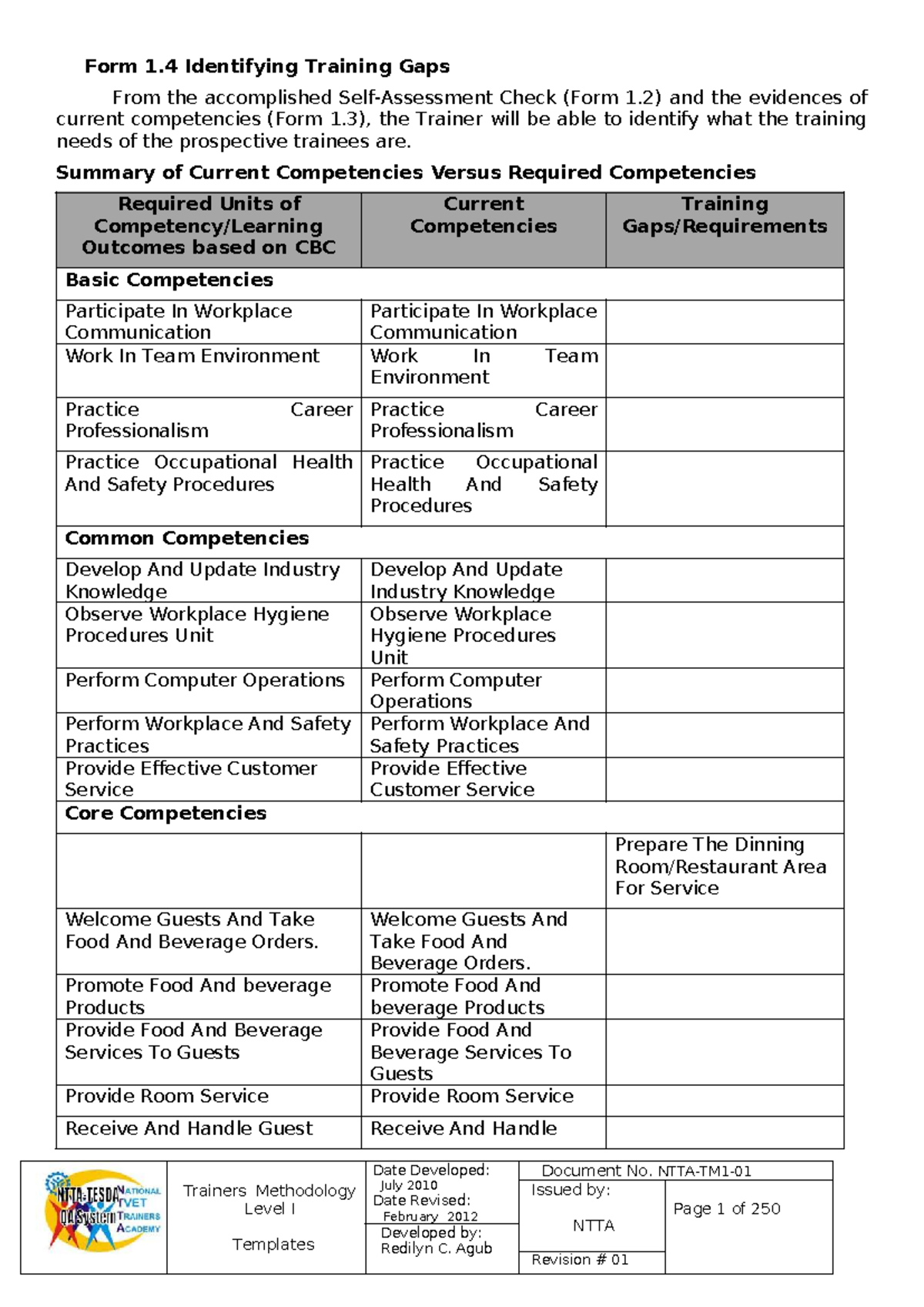 Form 1.4: Identifying Training Gaps and Competency Needs - Studocu
