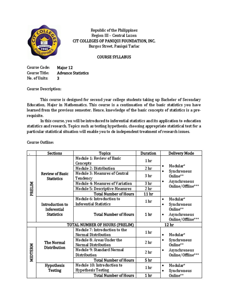 Advance Statistics Course Syllabus | PDF | Statistics | Test (Assessment)