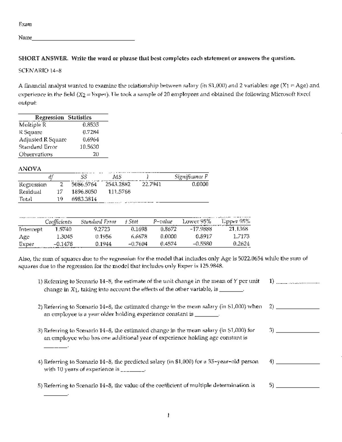 Sample Regression Questions: Exam Review for STAT 101 - Studocu