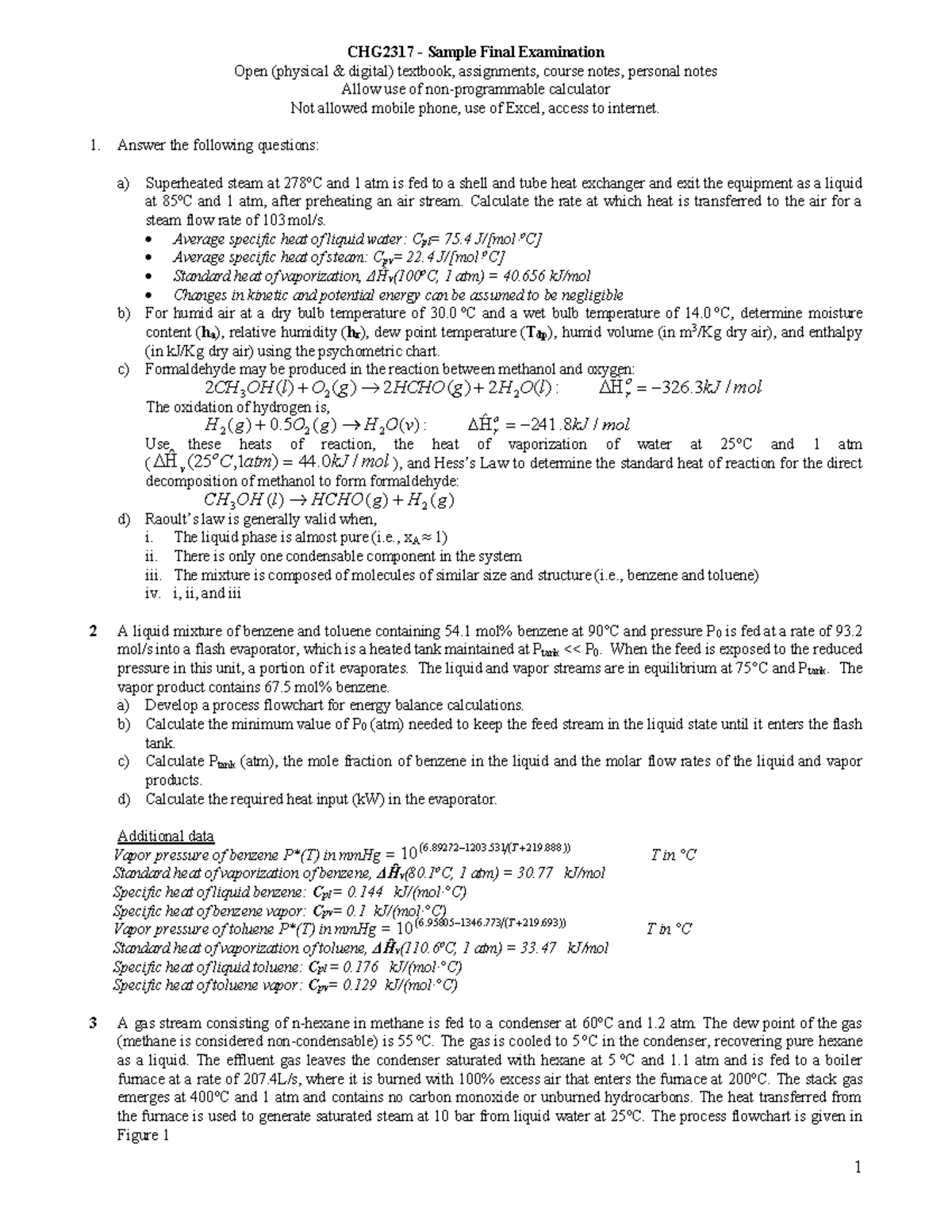 CHG2317 Sample Final Exam: Heat Transfer & Thermodynamics Concepts ...