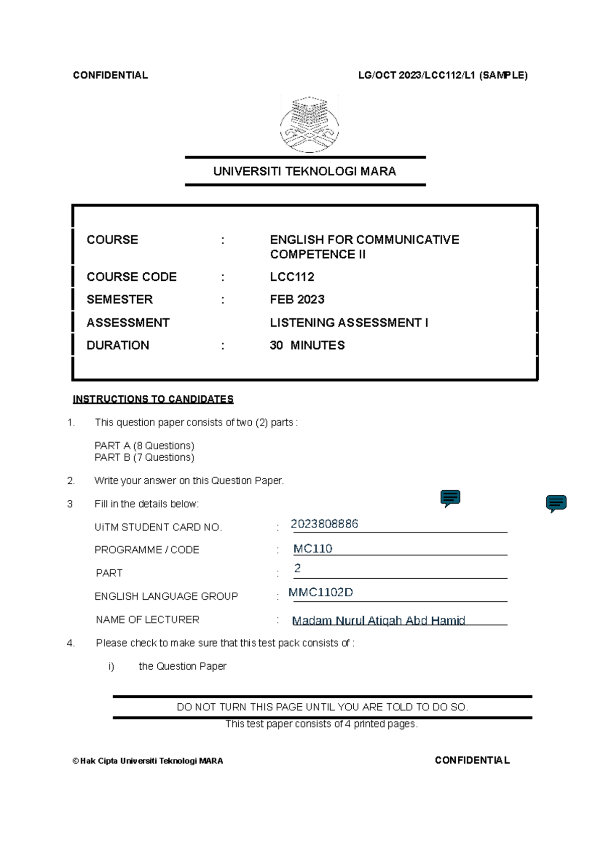 LCC112-Sample Listening Assessment I for Communicative English - Studocu