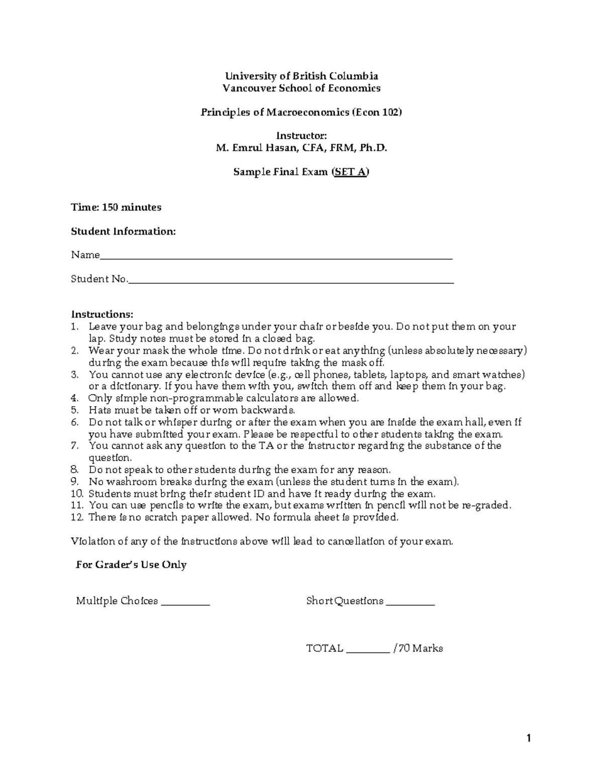 Econ 102 Sample Final Exam (SET A) - Questions Only - Studocu