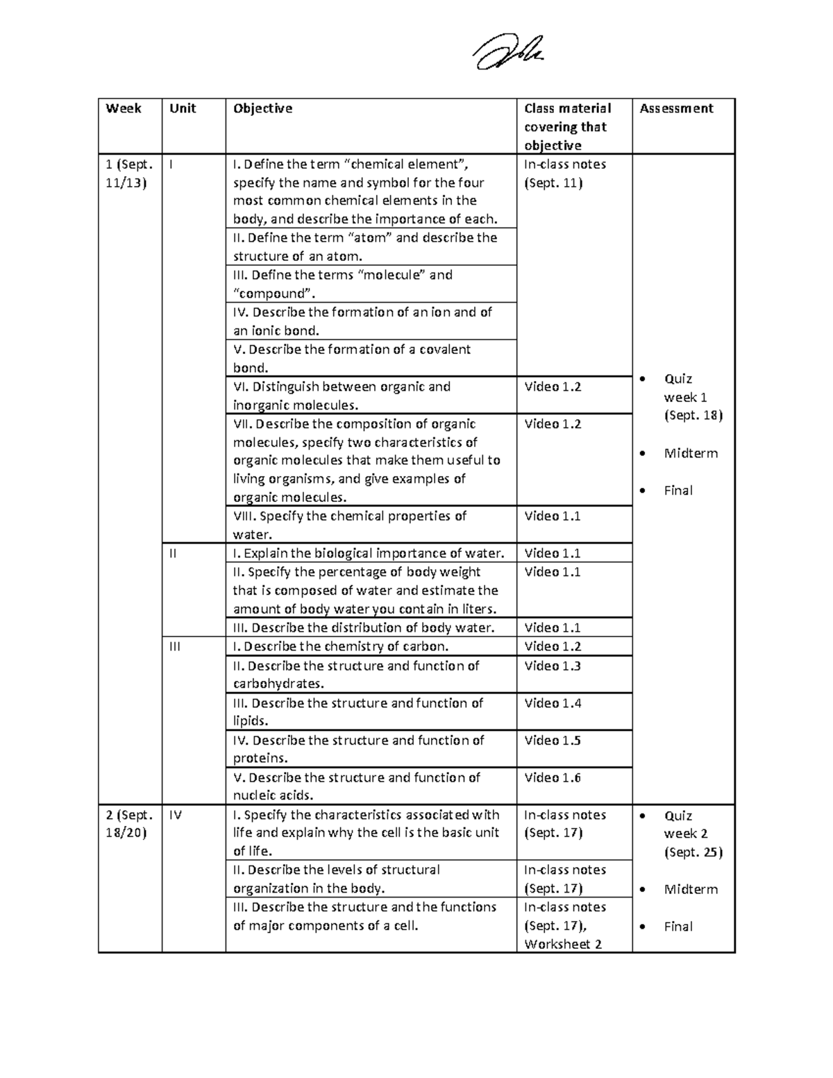 Course Objectives - Week Unit Objective Class material covering that ...