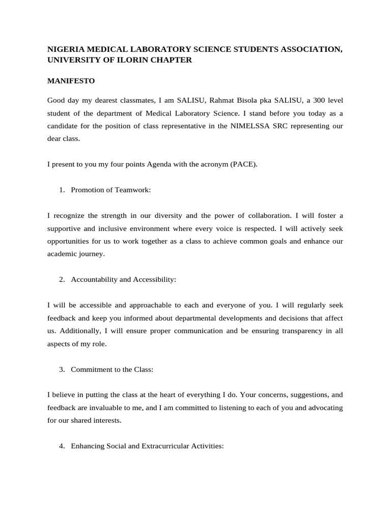 NIMELSSA Class Rep Manifesto: PACE Agenda | PDF