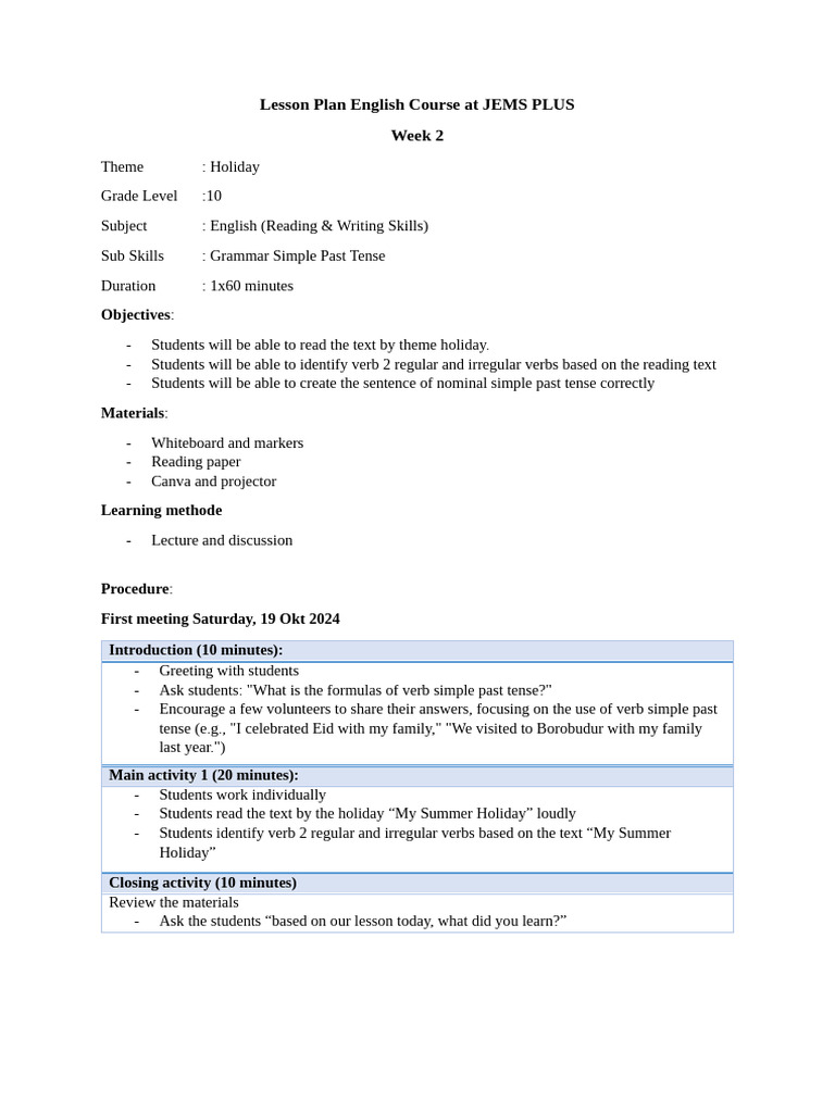 Lesson Plan English Course Week 3 & 4 | PDF | Verb | English Language