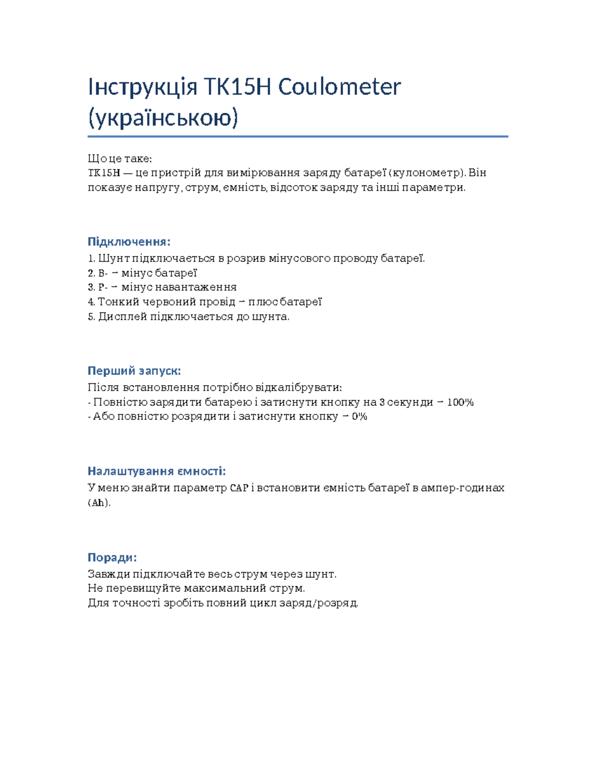 Інструкція до TK15H Coulometer: Налаштування та Підключення - Studocu