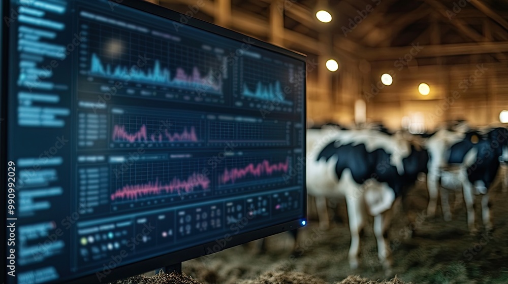Computer screen displaying data from sensors on a cowshed, concept of ...
