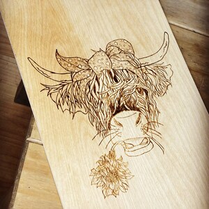 Highland cow pyrography commission on oak wood approximately 30cm ...