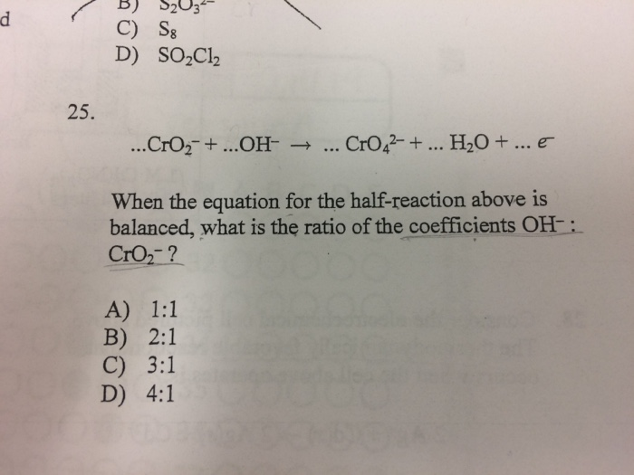 Solved C) S D) SO2CIh 25. CrO2-+ OH-→ CrO42-+ H2O + e- When | Chegg.com