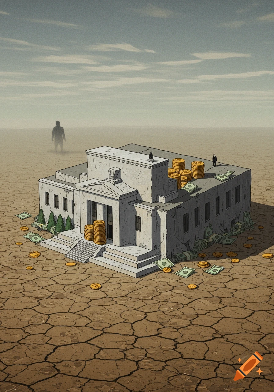 An illustrated bank-like building with money scattered on dry, cracked ...