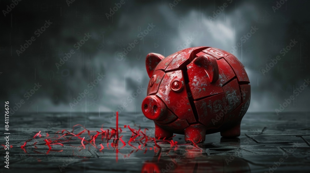Cracked piggy bank, dark cloudy background, downward red financial ...