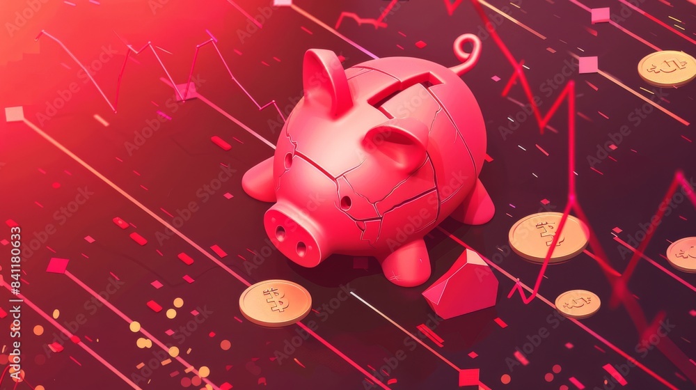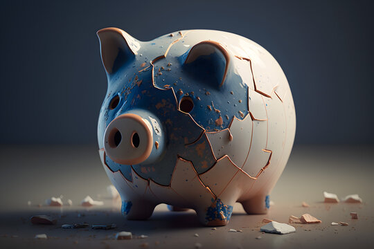 A cracked piggy bank with shards scattered and a falling red graph in ...