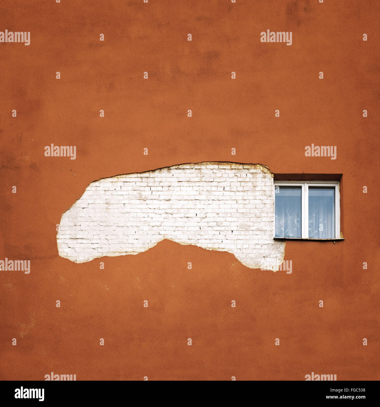 White Window On Orange Old House Wall Cracks In Concrete Visible Red ...