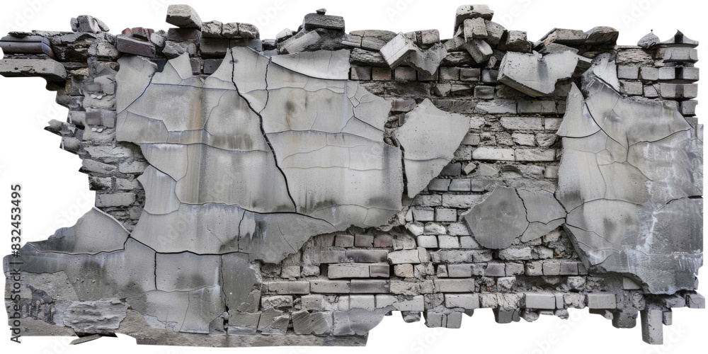 collapsed, cracked, damaged or broken concrete cement wall, isolated on ...