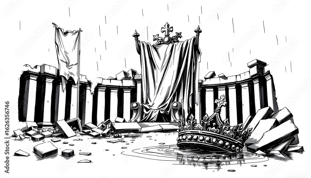 A black-and-white sketch of a collapsed throne room, its royal banners ...