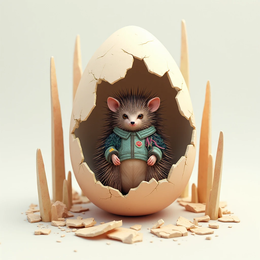 Egg, columns of regular shape, cracked, inside it is a cub of echidna ...