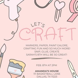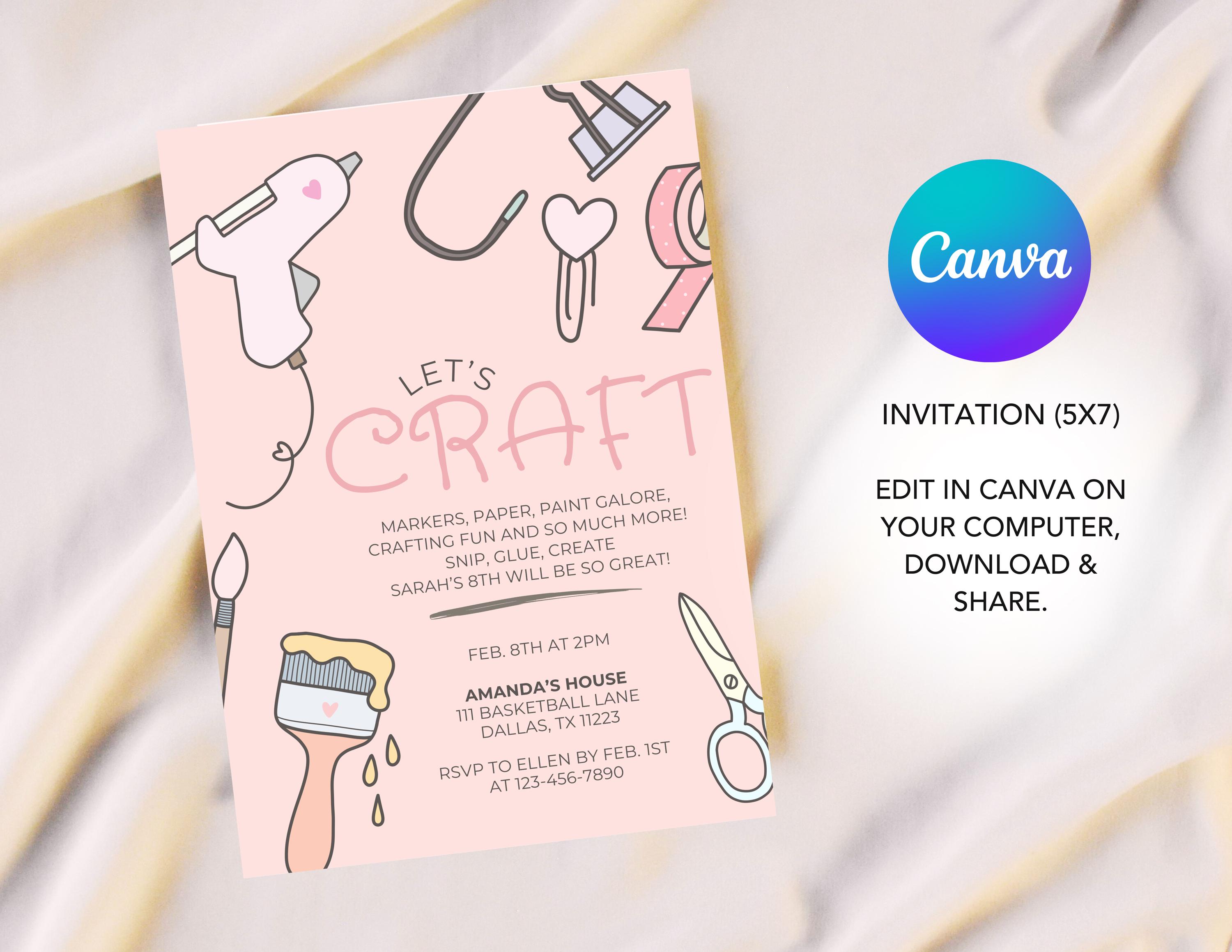 Girls Craft Party Invitation for Canva, Editable Arts and Crafts ...
