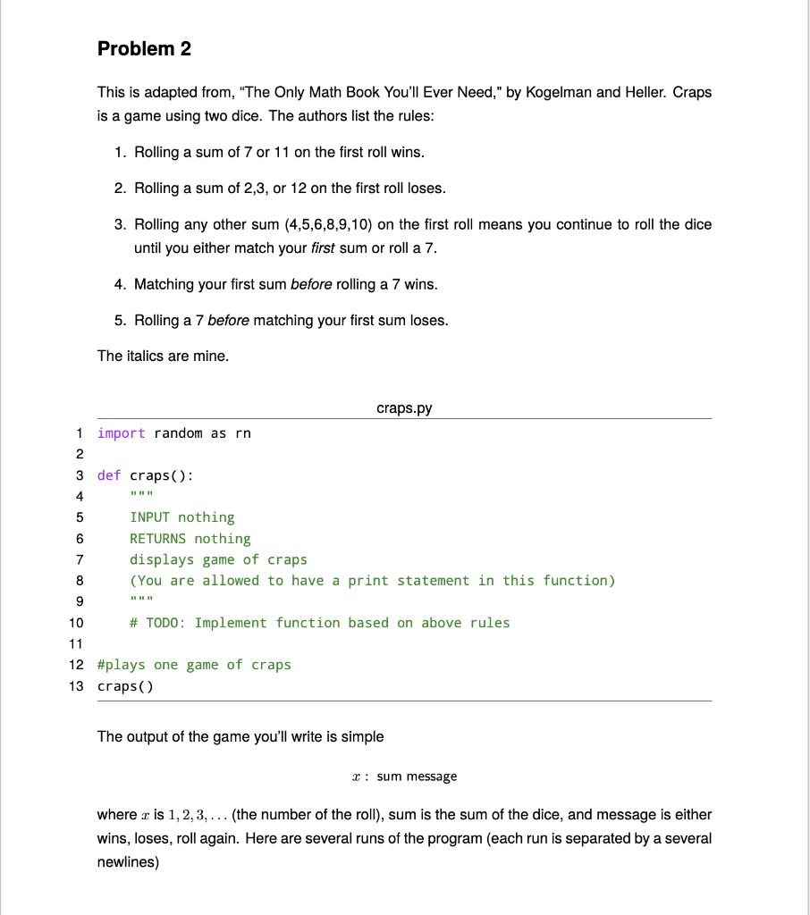 Solved Craps. Write a Python program (called q2.py) that | Chegg.com