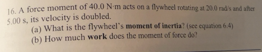 Solved: A force moment of 40.0 N·m acts on a flywheel rotating at 20.0 ...