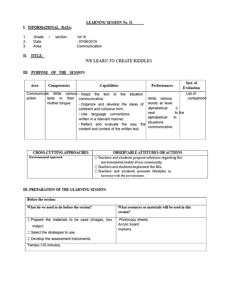 LEARNING SESSION No. 31 We Read and Create Riddles | PDF | Learning ...