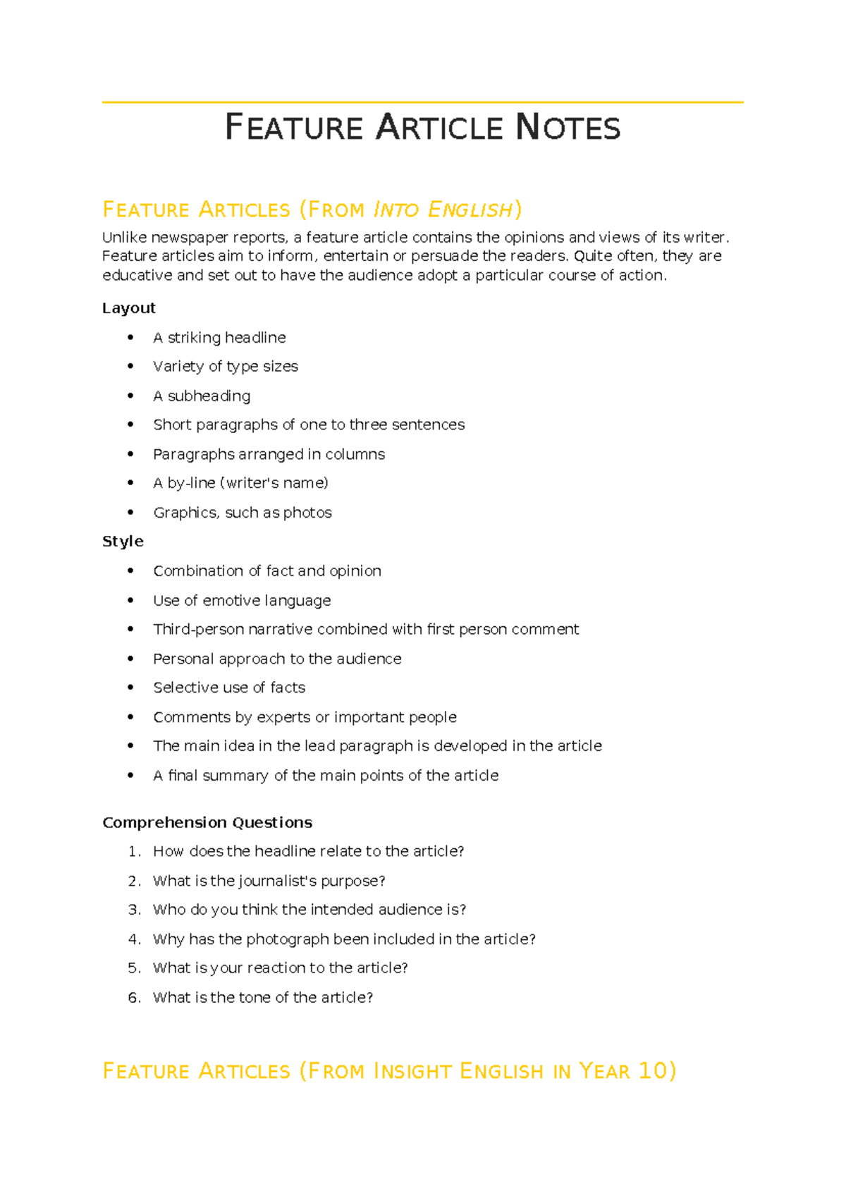 ENG 10: Feature Article Writing Notes - Structure, Style, and Purpose ...
