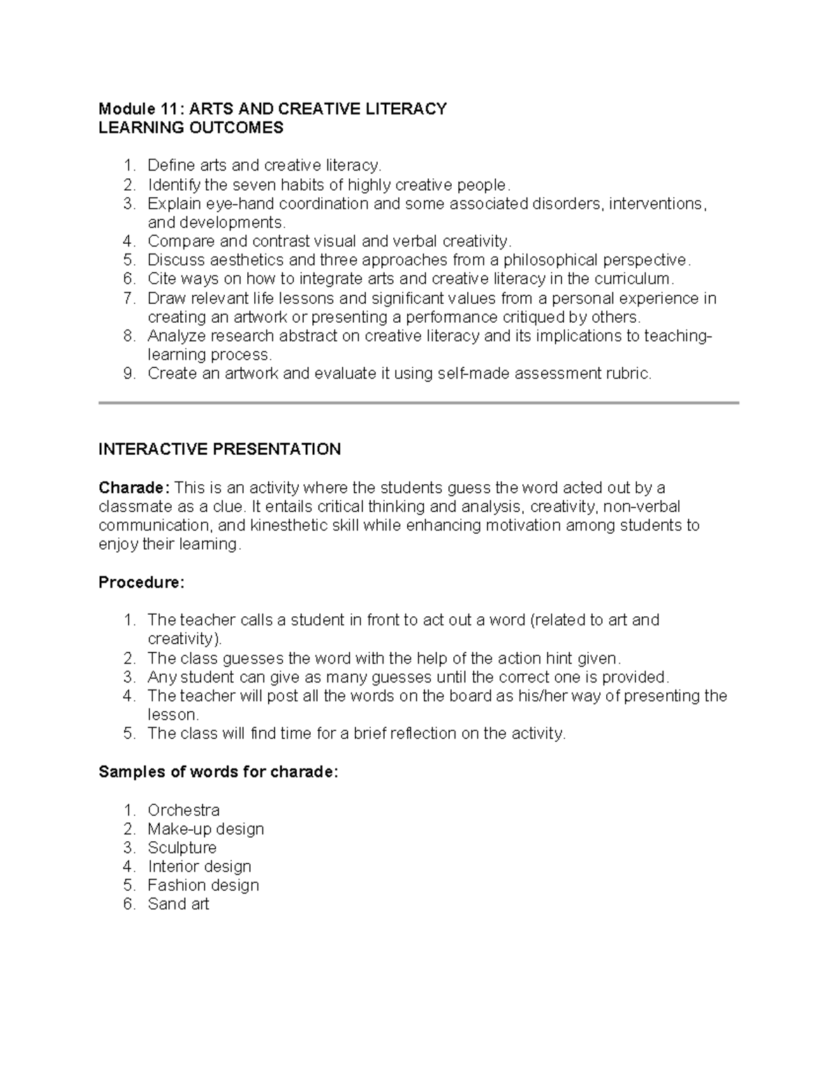 Module 11 EDUC 20 - Module 11: ARTS AND CREATIVE LITERACY LEARNING ...