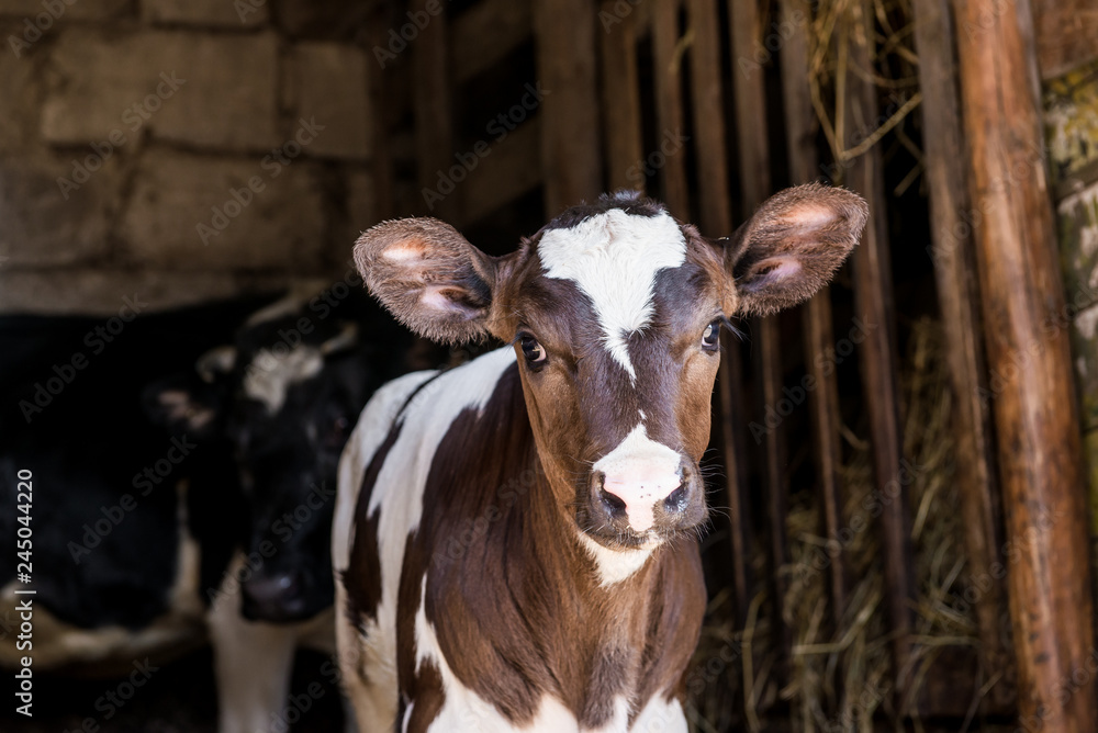 Animals in the stables.Photo of a little calf with mother of cow.The ...