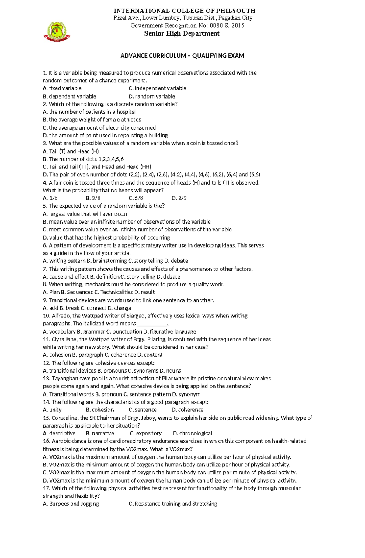 Advance Curriculum Qualifying EXAM - ADVANCE CURRICULUM – QUALIFYING ...