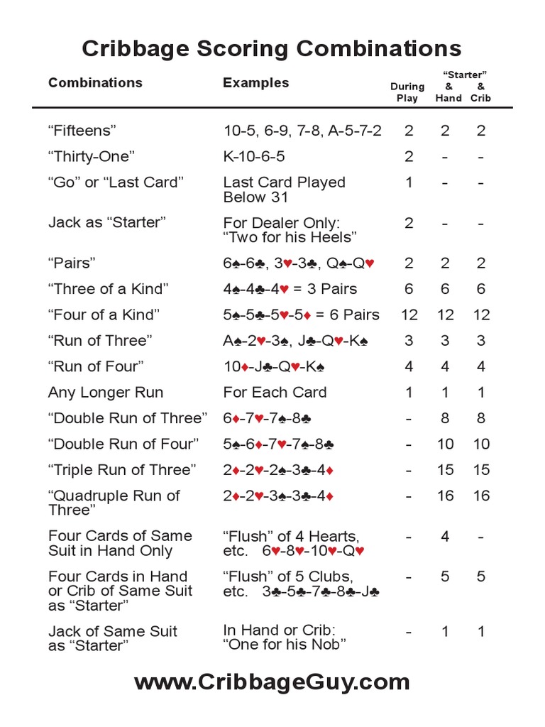 Printable Cribbage Scoring Chart