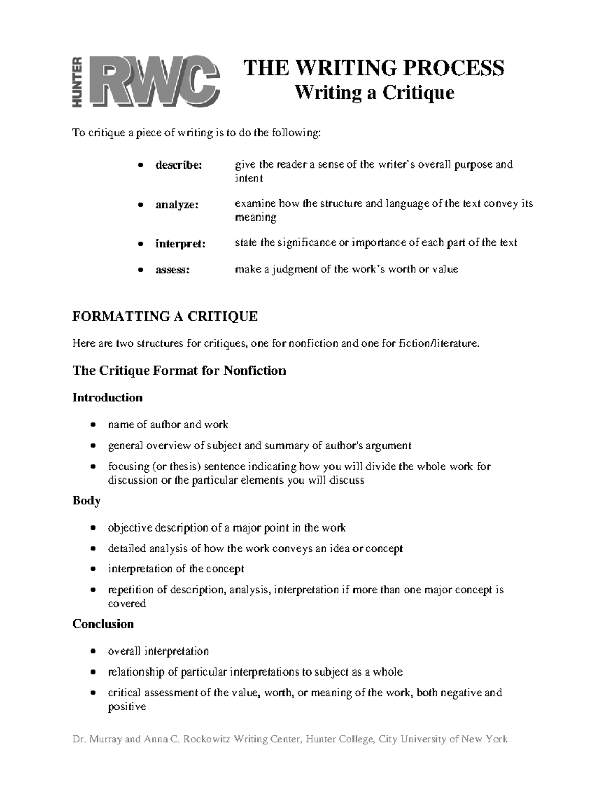 Writing a Critique - critic - THE WRITING PROCESS Writing a Critique Dr ...