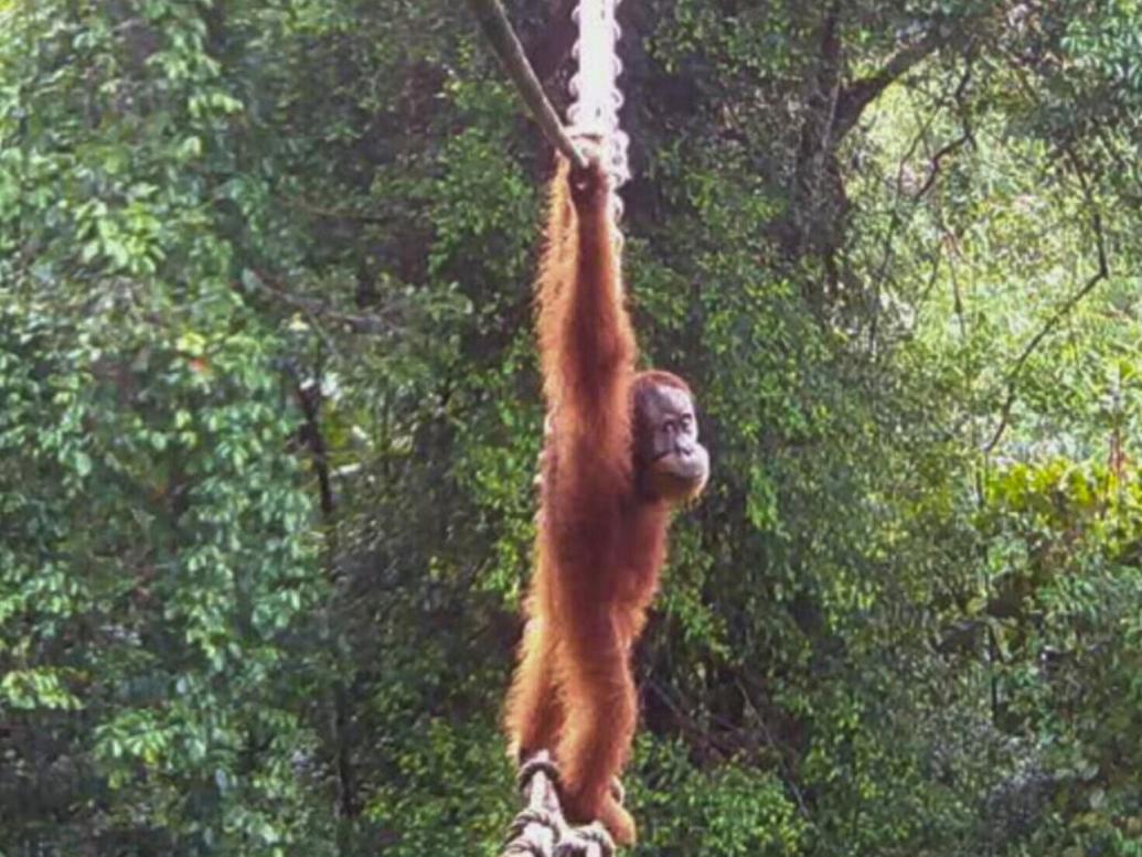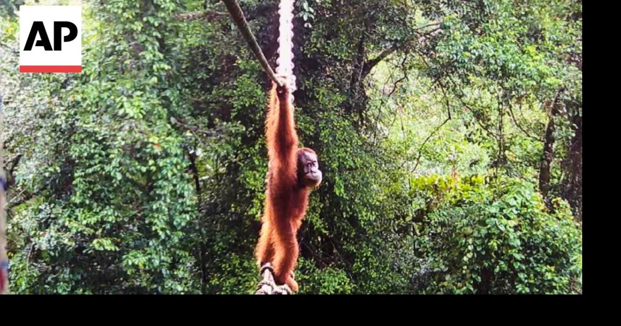 Sumatran orangutan uses canopy bridge to cross road in Indonesia ...