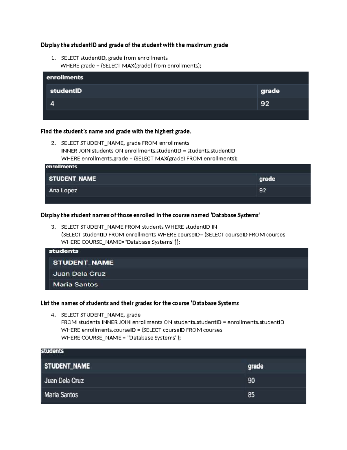 SQL Queries for Student Grades Analysis in Course ENROLL101 - Studocu
