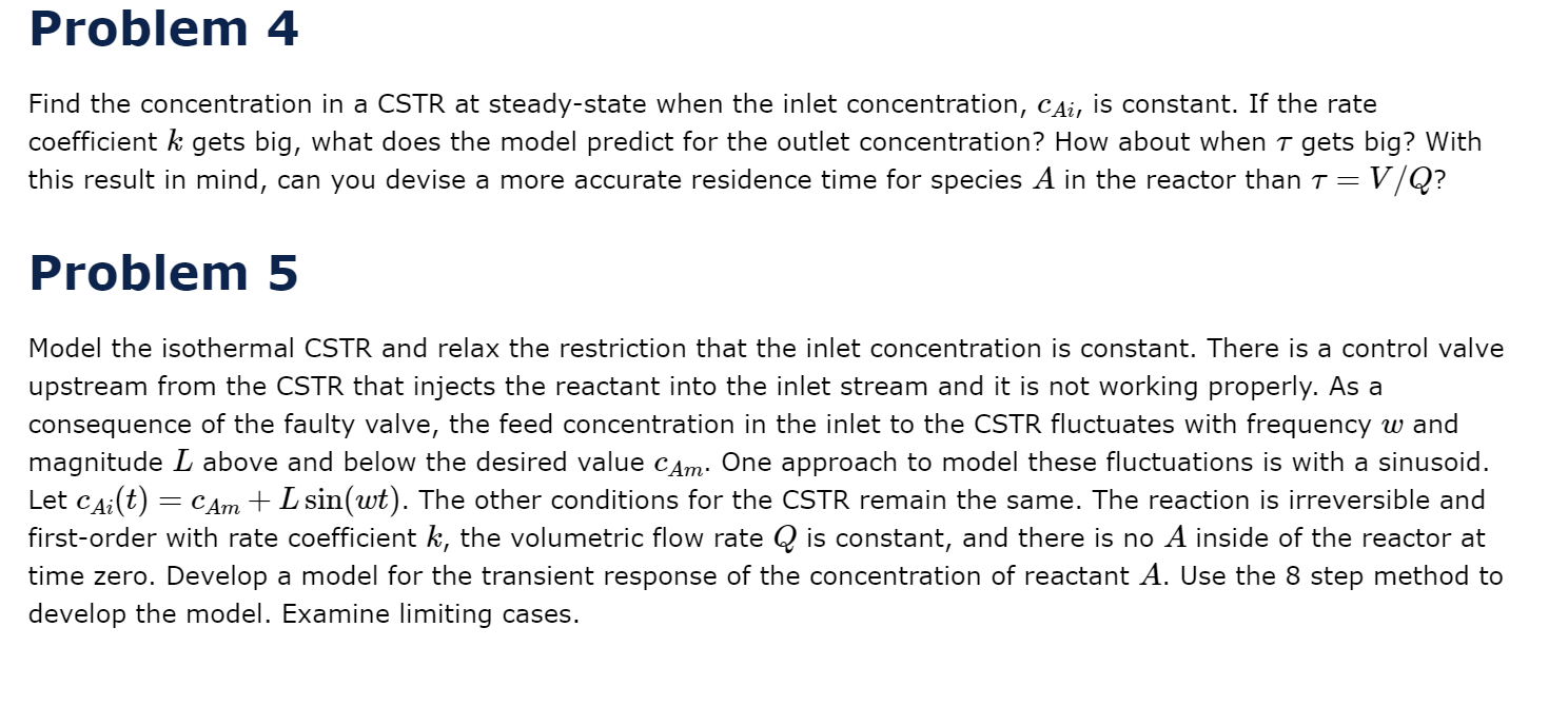 Solved Problem 4 Find the concentration in a CSTR at | Chegg.com
