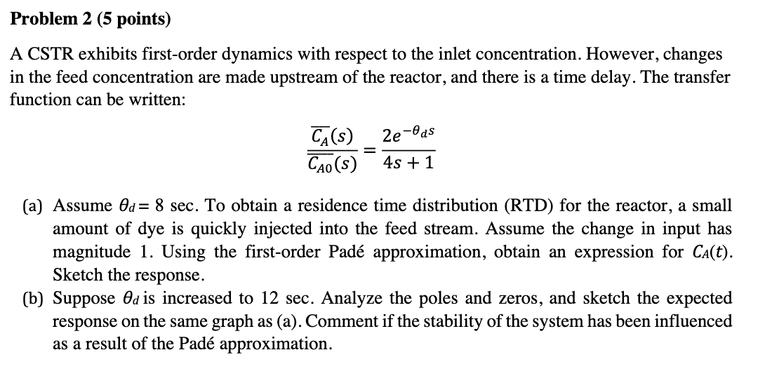 Solved Problem 2 (5 points) A CSTR exhibits first-order | Chegg.com