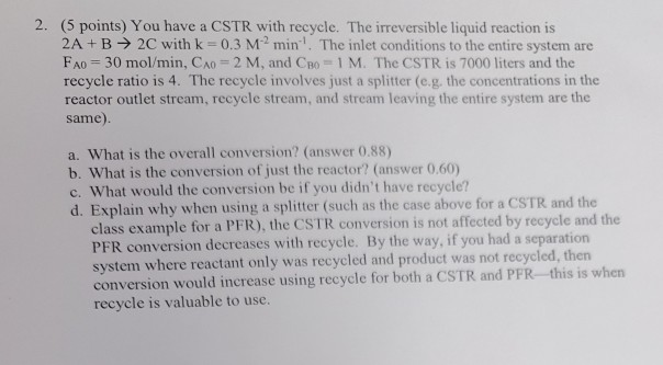 Solved 2. (5 points) You have a CSTR with recycle. The | Chegg.com